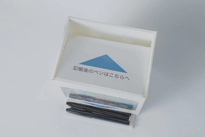 ペンは下の出口から取り出すようにし、使用後は上部の投入口へ投入してもらうスタイルに。