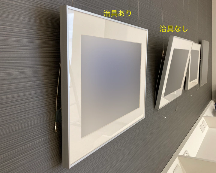 そこでこの度、構想数ヶ月を経てお辞儀対策治具を開発し、現在鳥取空港フォトコンテスト2022受賞作品展示において長期間(1ヶ月)の実使用試験を実施しています。 本記事冒頭の写真の通り、治具の有無でお辞儀抑制効果は一目瞭然かと思います。(展示作業中に撮影したのでワイヤーがはみ出てるのはご愛嬌)